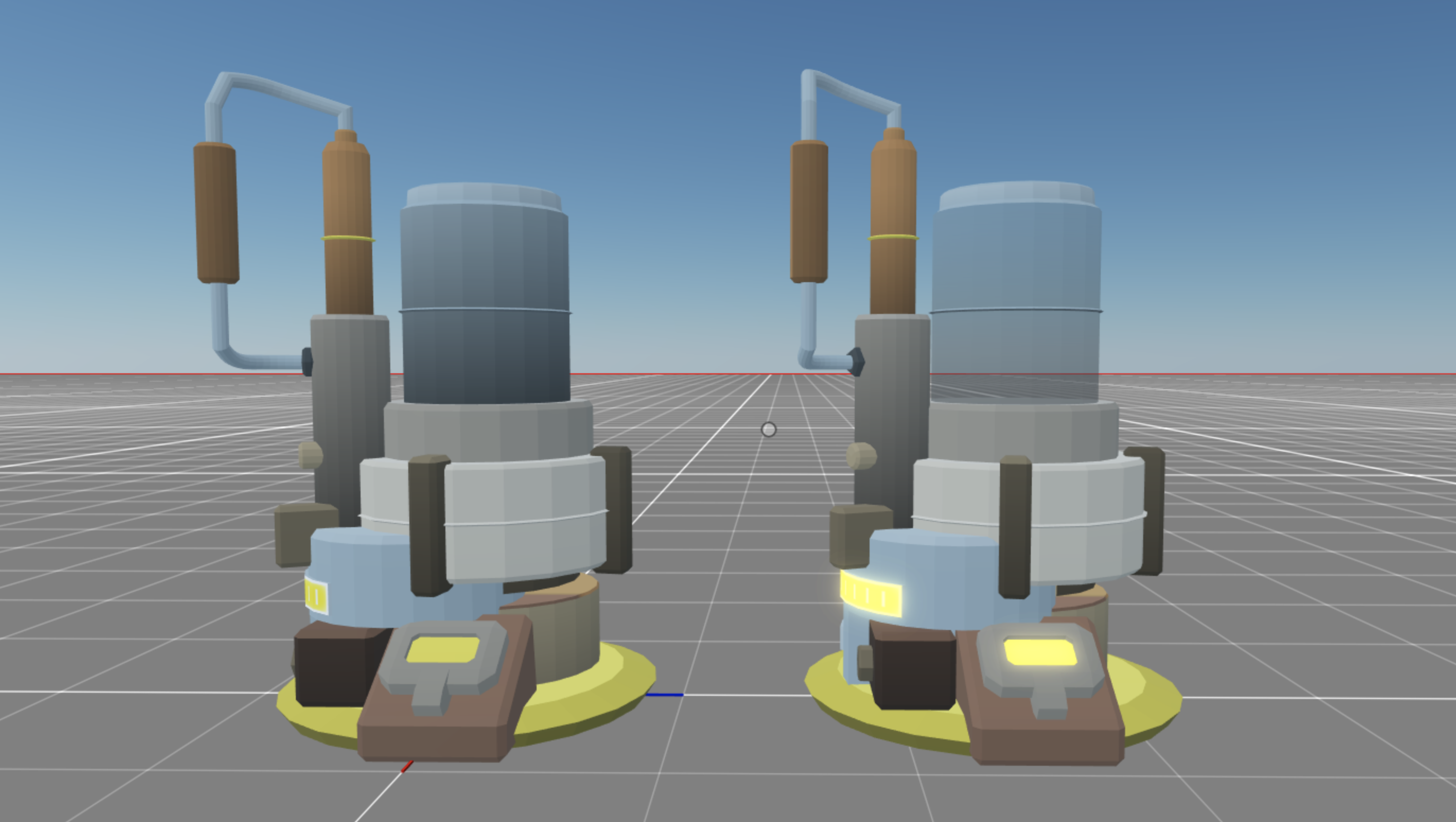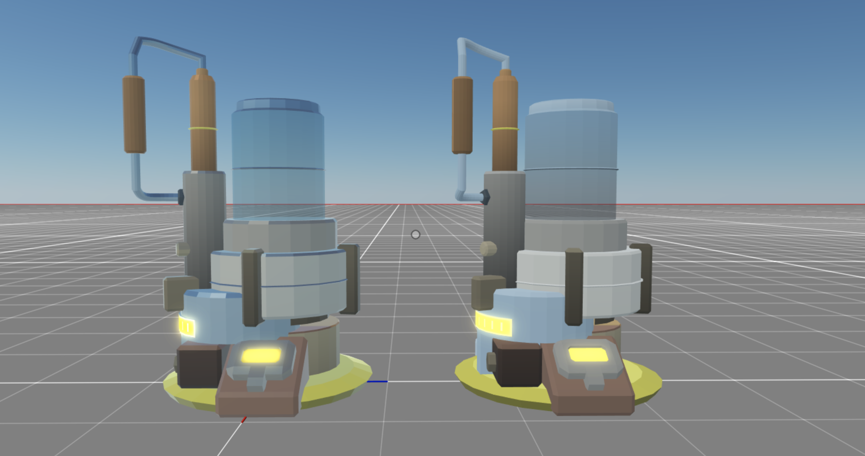 The image below shows two identical models, created with the same colors and textures. The model on the left uses all PBR materials, some of them include metalness, transparency, and emissiveness. The model on the right uses all standard materials, some including transparency and emissiveness.