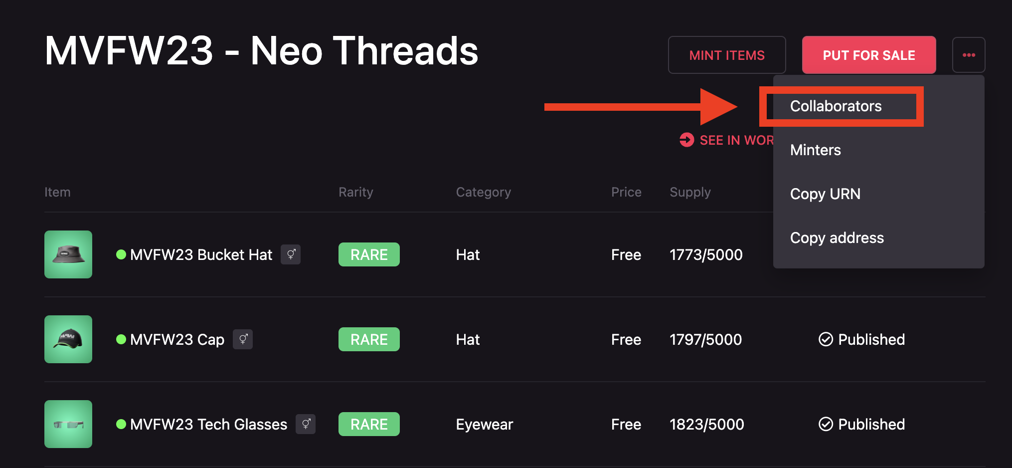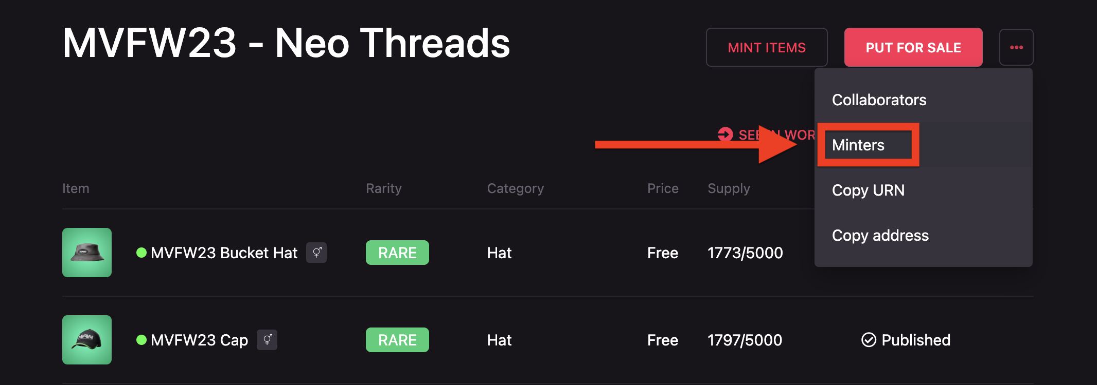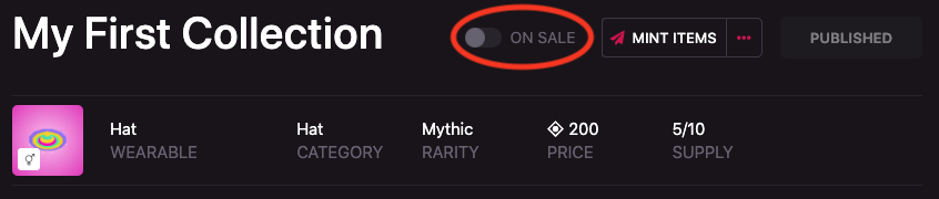 To mint published items, open the collection containing the items you’d like to mint, and click Mint Items.