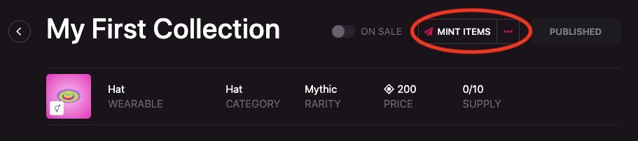 To mint published items, open the collection containing the items you’d like to mint, and click Mint Items.