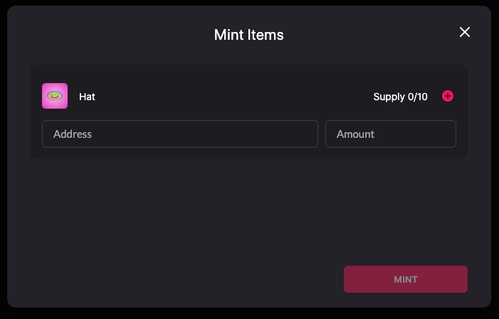 You will be shown a modal window containing a list of the items available along with the supply available for each. Remember, the supply is the total number of items you can mint. For example, if your supply reads 0/10, then you have used 0 out of your total supply of 10.